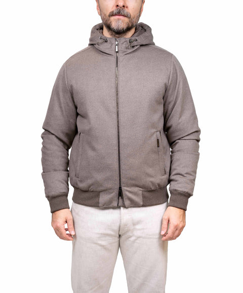 Bomber con cappuccio completamente imbottito con piuma d’oca e trapuntato a boudin. Realizzato in flanella australiana extra fine garzata, caratterizzata da una mano morbida e confortevole. Flanella australiana, Cappuccio regolabile da coulisse elastica, Chiusura frontale con zip a doppio cursore, Tasche a filetto verticali con zip in vita, Fondo capo e polsi in maglia, Comode tasche interne porta valori.