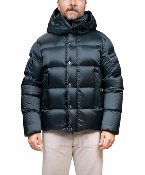 Bomber dall'elevato grado di isolamento termic, color ottanio.Realizzato in tessuto tecnico con resinatura idrorepellente, imbottito in piuma d’oca e trapuntato a boudin. Ampio cappuccio staccabile e regolabile, con baveri antivento chiusi da bottoni a pressione, Doppia chiusura frontale con bottoni a pressione a vista e zip a doppio cursore in metallo, Ampie tasche a filetto laterali, chiuse con zip a vista, Taschino a filetto chiuso da zip sul braccio, Polsi interni in maglia, Internamente trapuntato a boudin sul lato schiena, Doppia tasca interna porta valori.