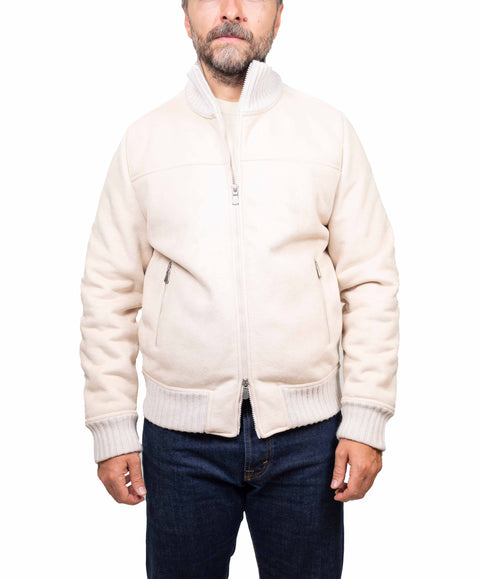 Giubbino in eco montone con chiusura zip doppio cursore e tasche laterali a filetto con zip. Collo a lupetto, polsini e fondo in maglia Super Geelong aumentano l'aderenza al corpo. Prodotto in Italia.