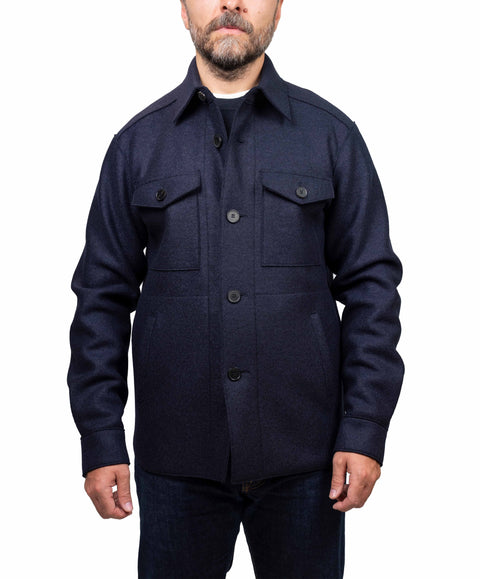 Giacca corta monopetto, dalla linea dritta, con tasche a filetto, chiusura a 4 bottoni, colletto a camicia, 2 tasche applicate sul petto e chiusura con bottoni sui polsini, due tasche sulla lunghezza del taglio. Finitura a taglio vivo. Prodotto in Italia con tessuto italiano.