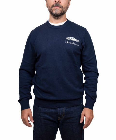 Maglione con scritta “i hate electric” in bianco su maglione blu