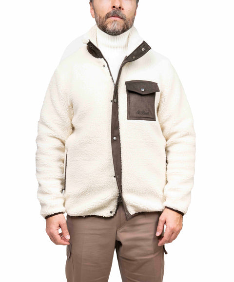 Giaccone Saint Barth, in orsetto colore bianco , tasca frontale marrone e due laterali basse. Interno tessuto tecnico.